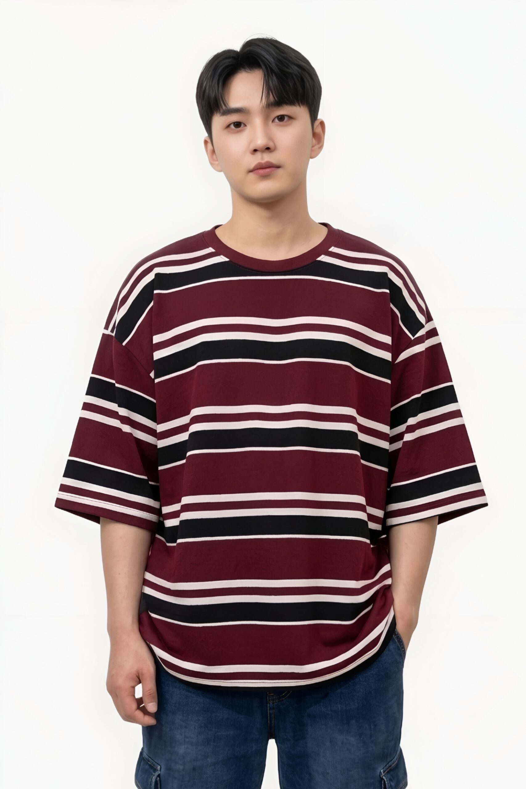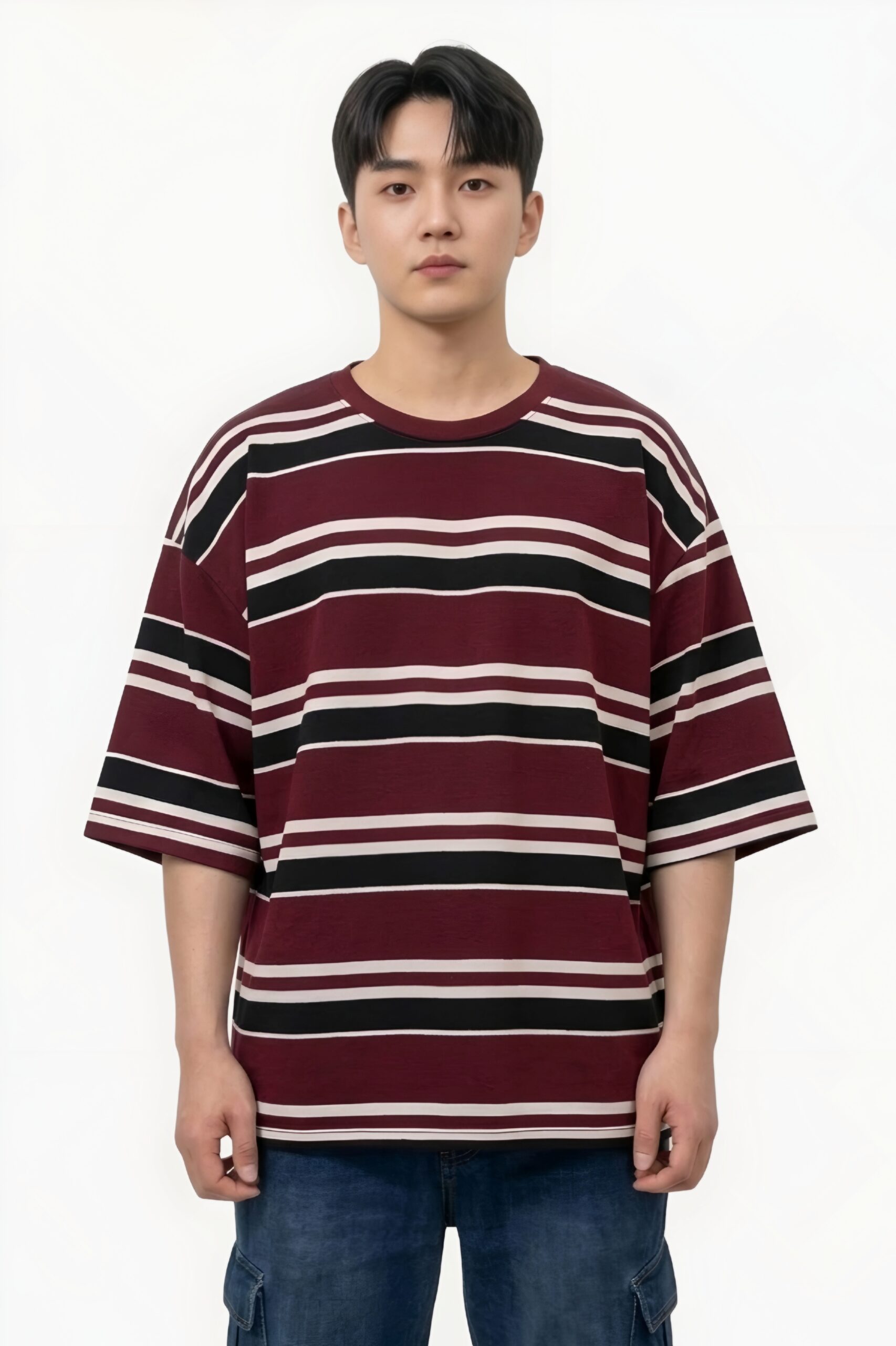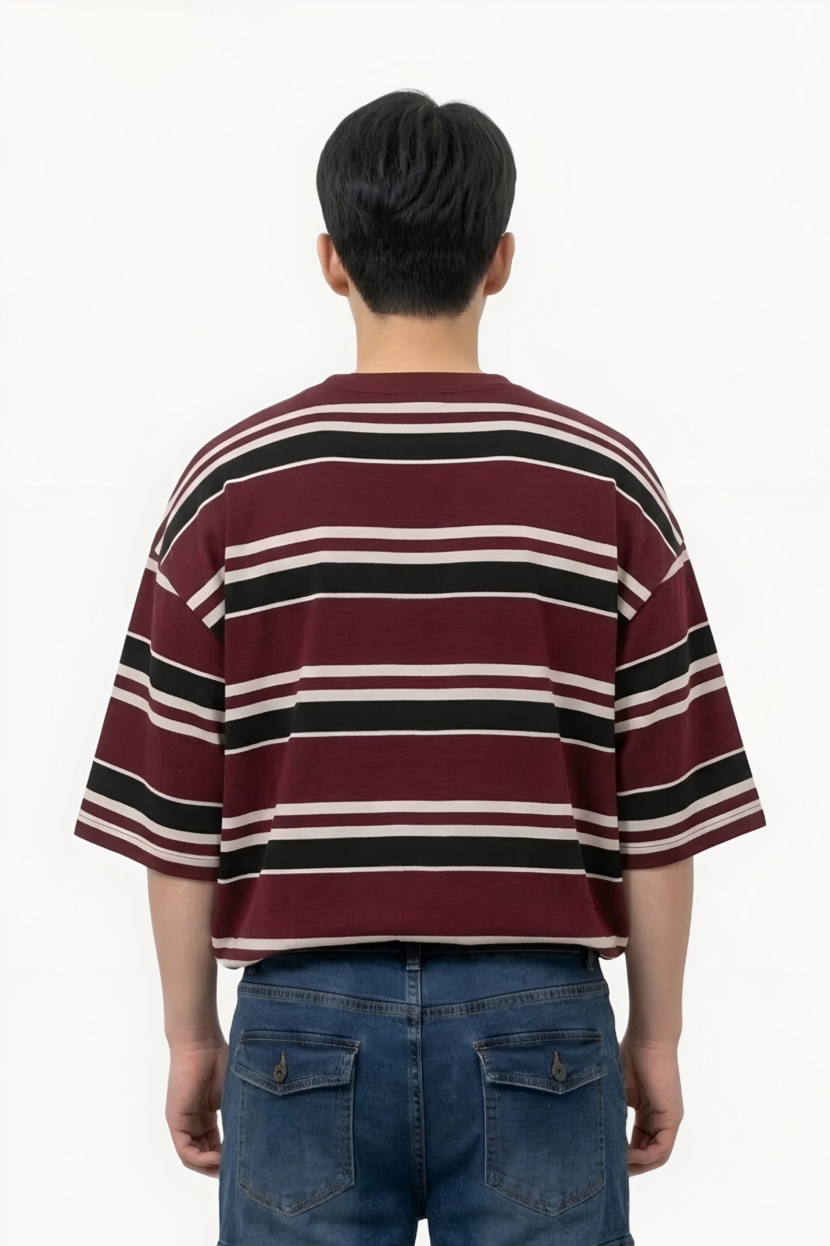 The drop shoulder design creates a relaxed oversized silhouette that gives the T-shirt a trendy and effortless look while ensuring maximum comfort. Its bold horizontal stripe pattern in rich burgundy tones adds a refined and stylish feel that stands out without being overly flashy.